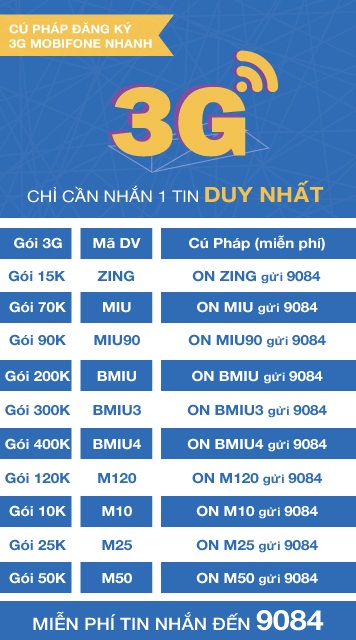 3G Mobifone sẽ mang đến cho bạn những tính năng, tiện ích thiết thực nhất khi sử dụng điện thoại. Để đăng ký 3G Mobi bạn chỉ cần thực hiện một thao tác nhắn tin như sau: